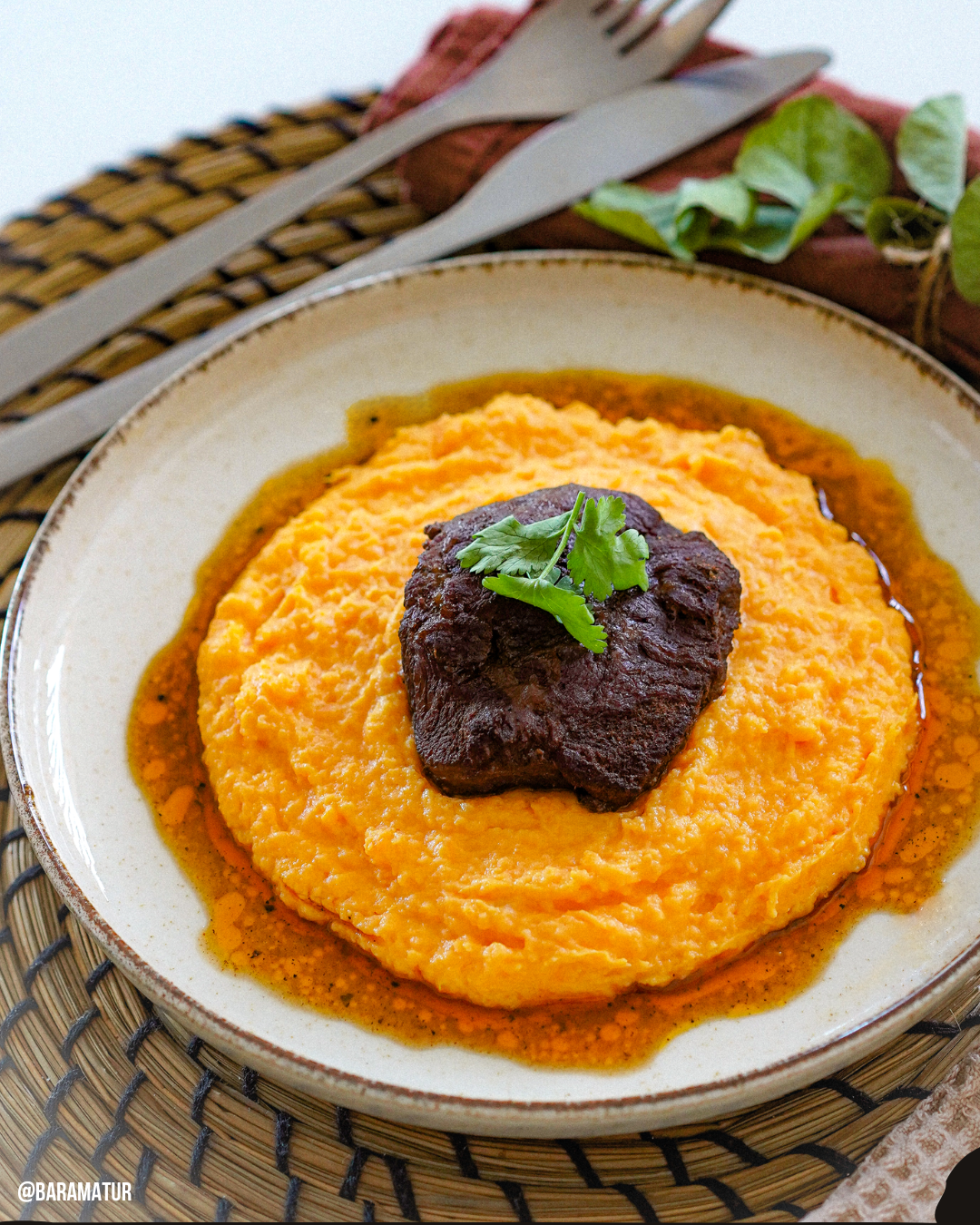 Mjúkar grísakinnar eldaðar í rauðvíni með creamy sætkartöflumús